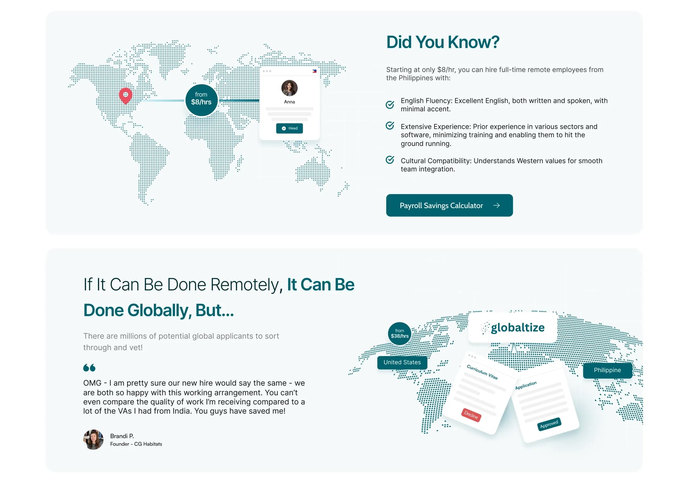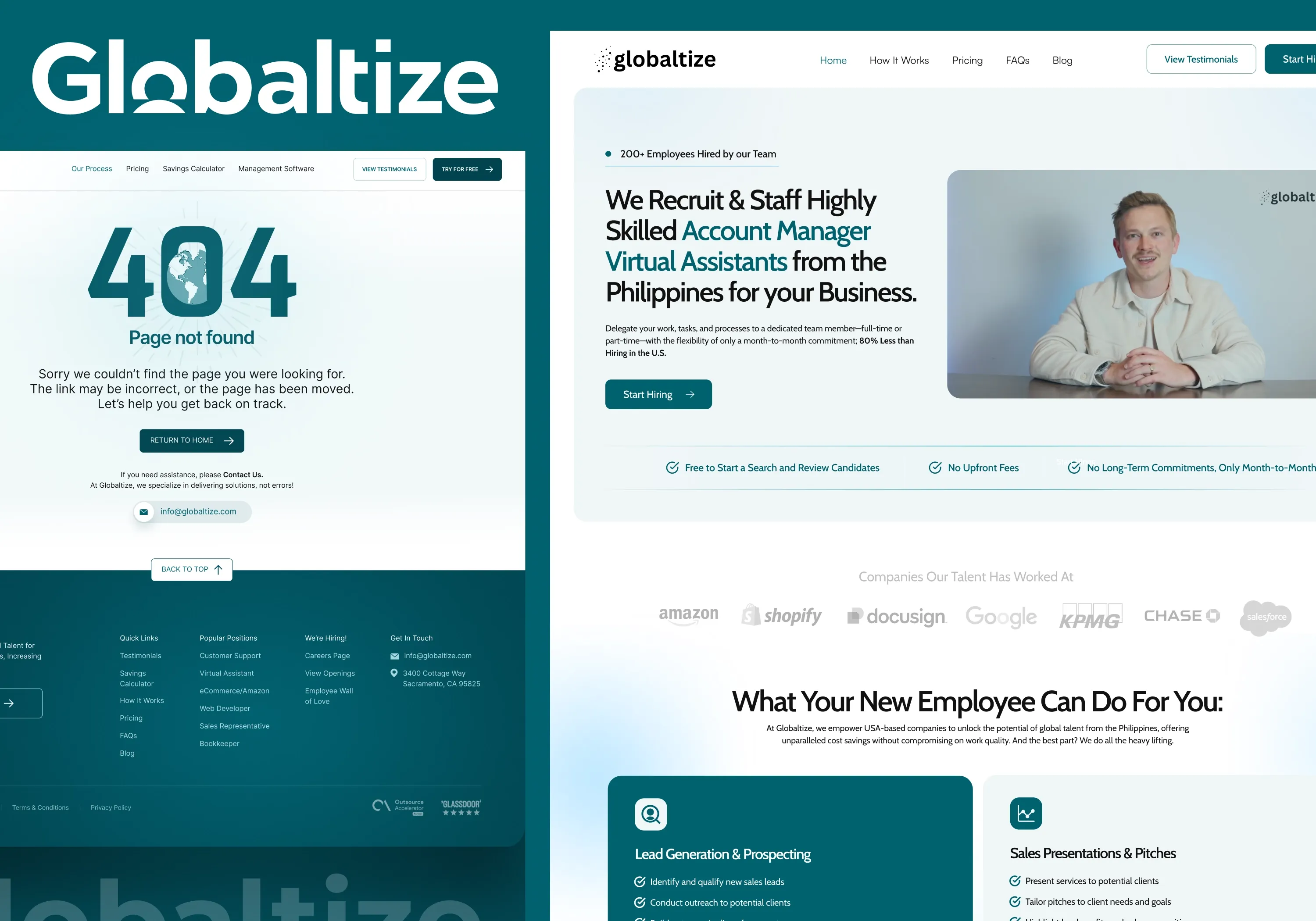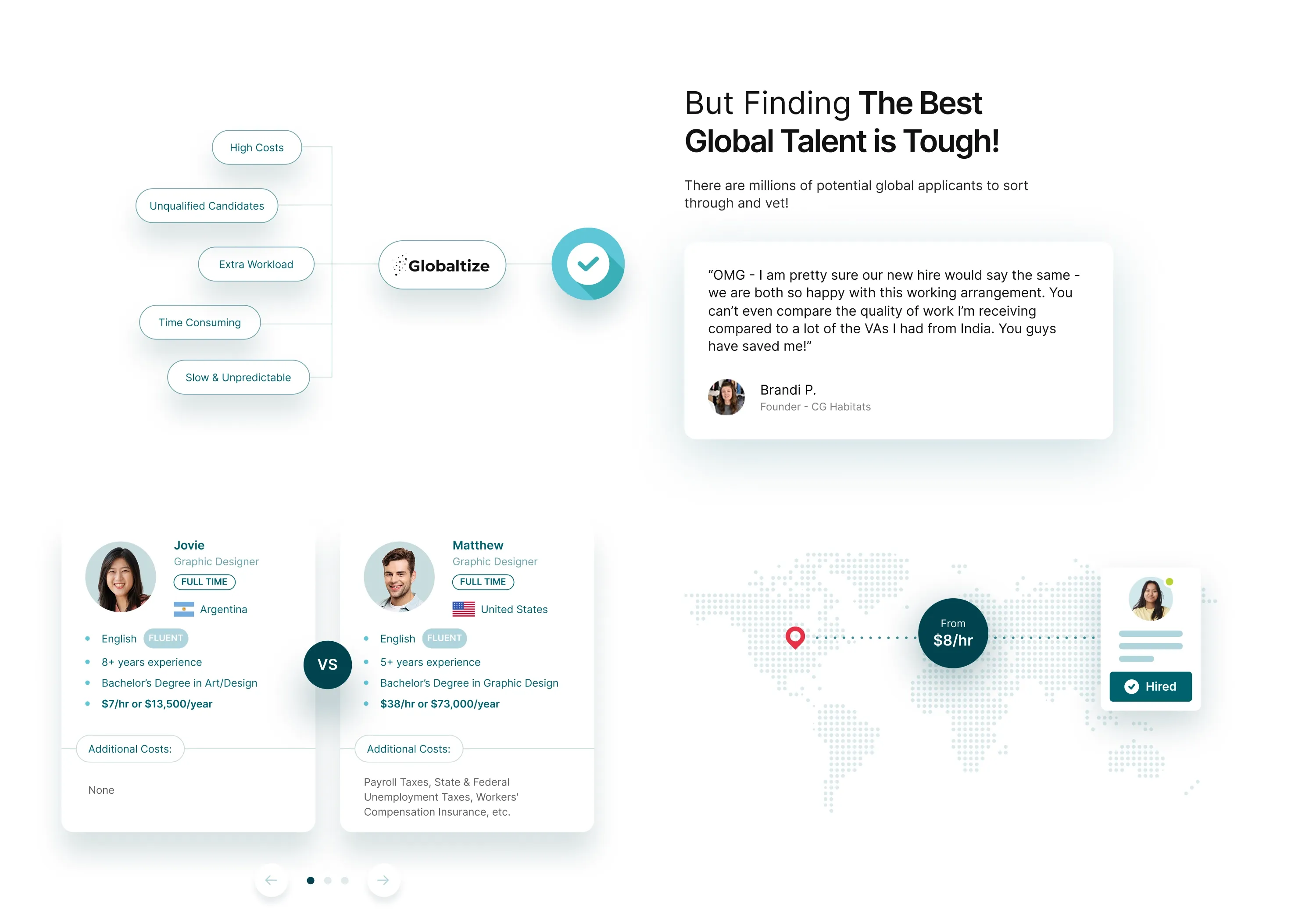 Globaltize —Democratizing global hiring by simplifying cross-border recruitment, compliance, and payroll. We designed a unified, end-to-end management dashboard that takes the guesswork out of building a global team. By integrating a seamless 10-step recruitment funnel (from AI screening to background checks) directly into an intuitive payroll and tracking system, we empowered businesses to hire the top 1% of remote talent and manage international contractor agreements without the traditional HR headaches.